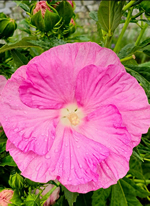 Гофрированный розовый с темным глазком. Диаметр 30 см. Листья овальные,