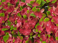 Гортензия с крупными розовато-красными соцветениями. Побеги прочные,