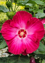 Гофрированный розовый с темным глазком. Диаметр 30 см. Листья овальные,